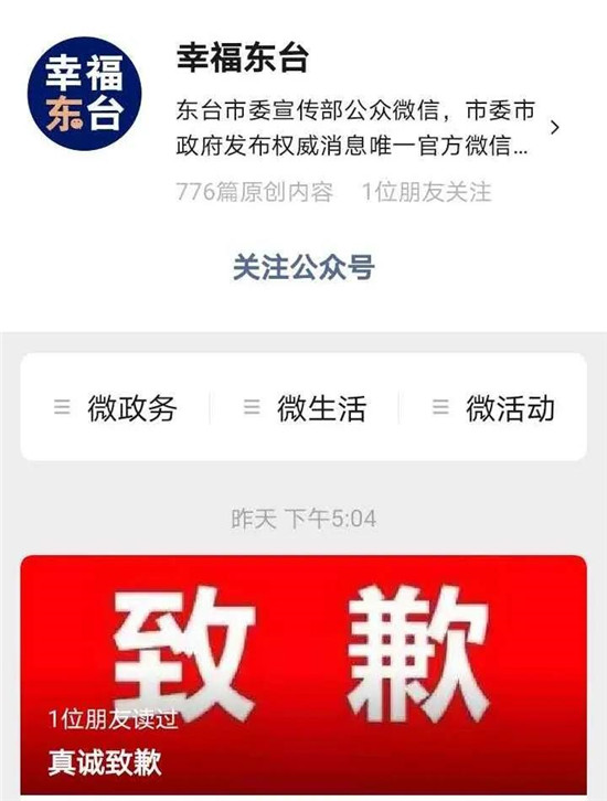 上述东台市委宣传部官方微信公众号在致歉文中表示:“小东想说的是,对于这件事的发生除了遗憾,我们更深深自责,我们接受媒体和网友的批评和监督。但是也请大家放心,东台是一座美丽的古城,东台人自古以来向上向善。”