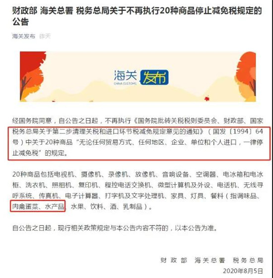 这20种将享有关税减免的商品中也有“肉禽蛋菜、水产品”。(来源:海关发布)