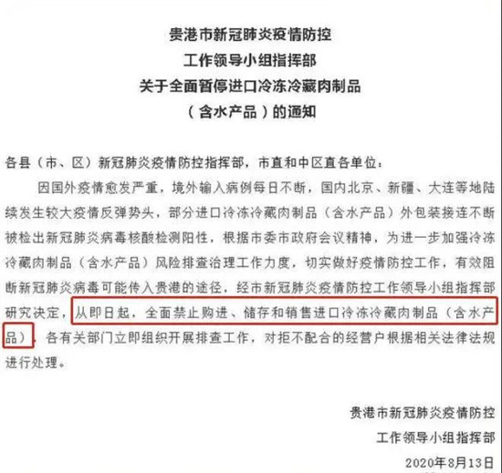 贵港市下发文件 全面暂停进口冷冻冷藏肉制品(含水产品)通知