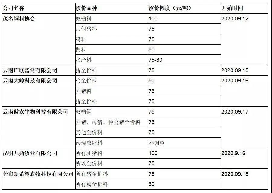 由于近期饲料原料价格大幅上涨,为保证产品质量,云南广联畜禽有限公司、云南大鲸科技有限公司、云南傲农生物科技有限公司、昆明九鼎牧业有限公司、芒市新希望农牧科技有限公司决定进行饲料涨价,其中猪全价料上涨75元/吨,乳猪料上涨75-100元/吨,禽料上涨50元/吨。