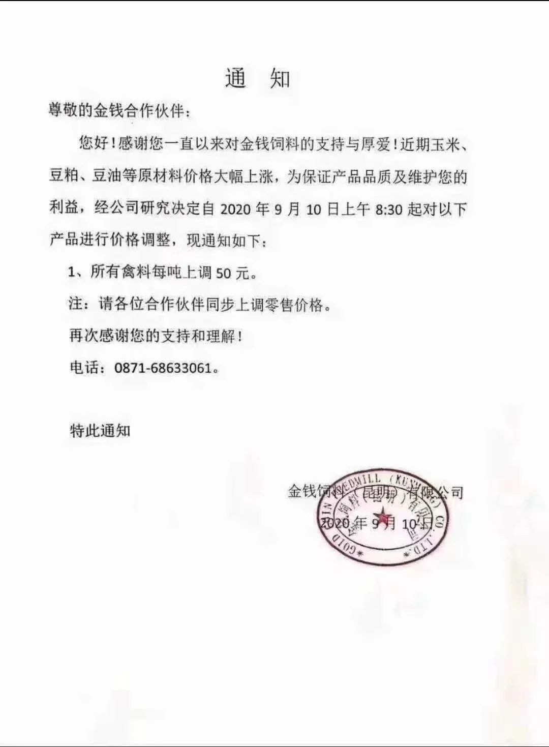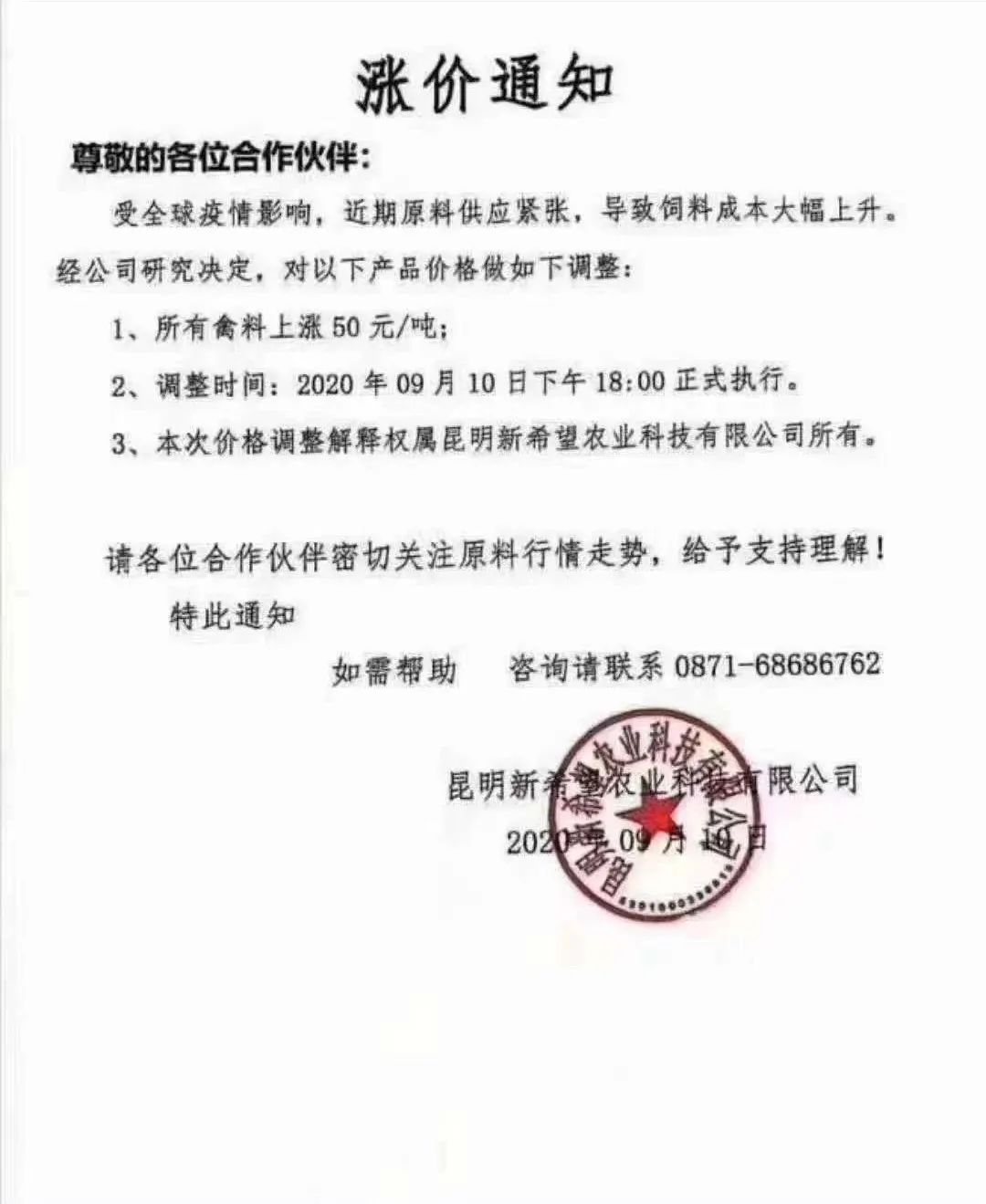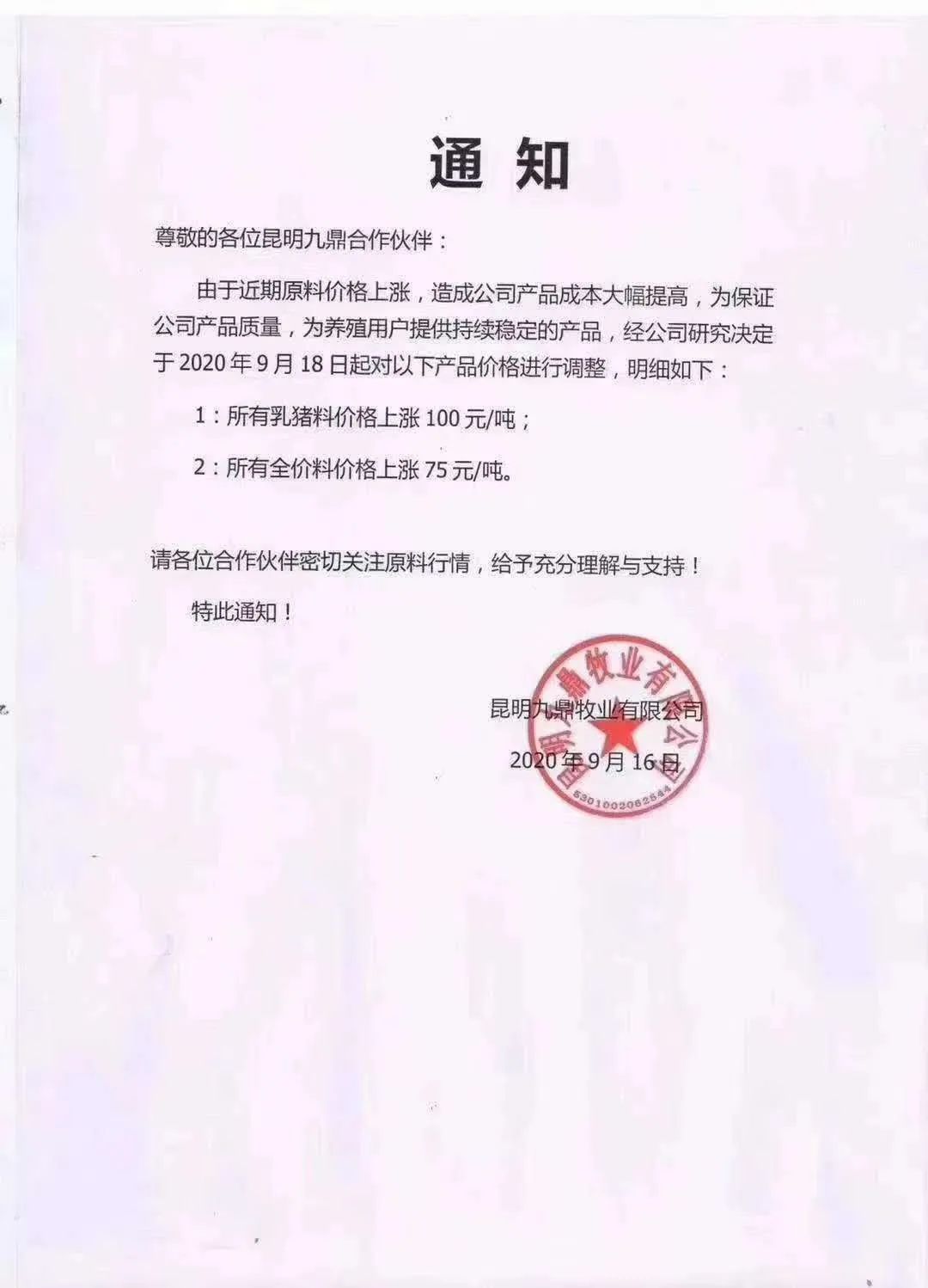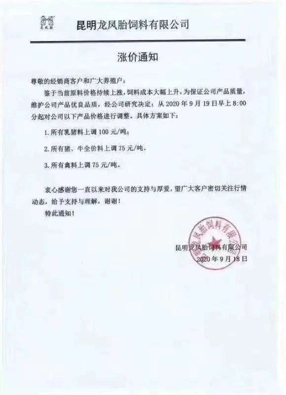 9月17日,云南傲农发布通知表示,近期原料价格(玉米、豆粕、碎米、豆油等)价格大幅度上涨,导致饲料成本大幅度上升。为保障产品质量,自2020年9月20日起,教槽料上调75元/吨,乳猪全价料、母猪全价料、种公猪全价料以及其他全价料上调75元/吨。预混料、浓缩料价格暂不作调整。