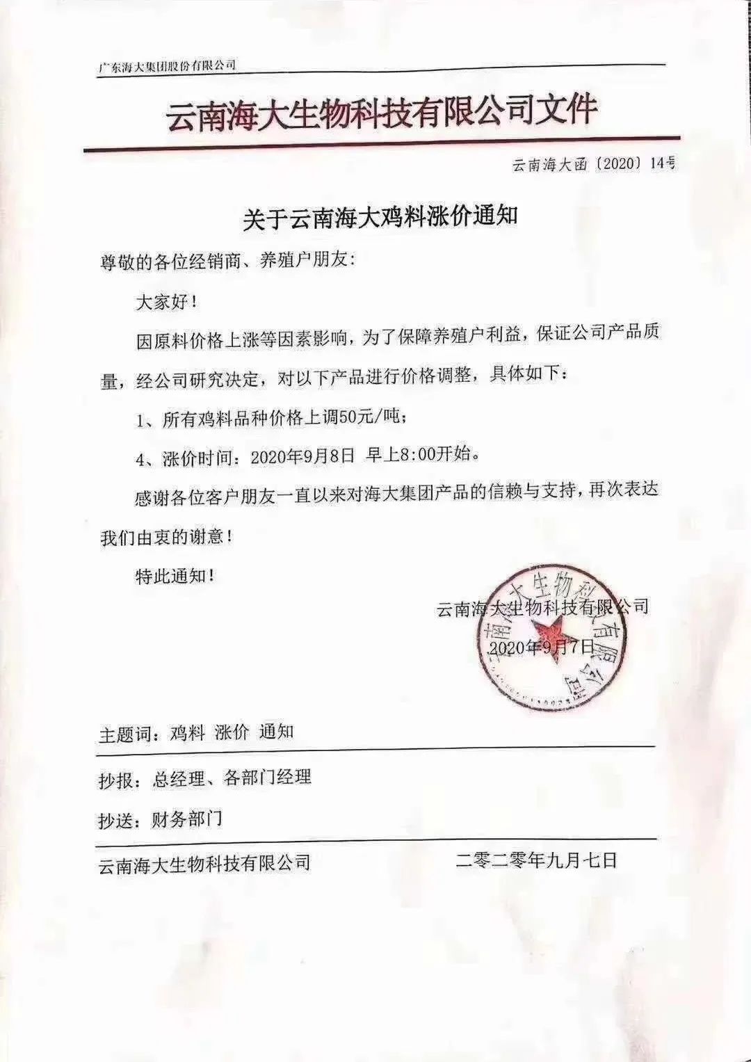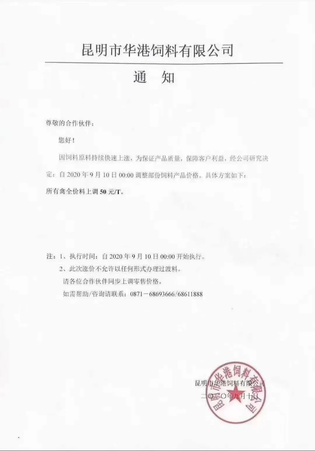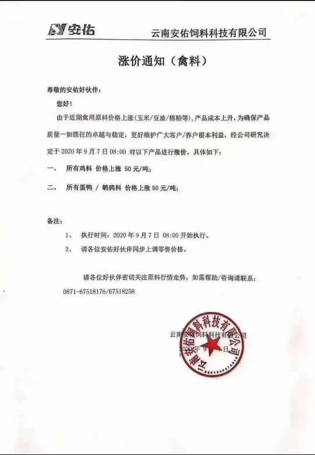9月17日,云南傲农发布通知表示,近期原料价格(玉米、豆粕、碎米、豆油等)价格大幅度上涨,导致饲料成本大幅度上升。为保障产品质量,自2020年9月20日起,教槽料上调75元/吨,乳猪全价料、母猪全价料、种公猪全价料以及其他全价料上调75元/吨。预混料、浓缩料价格暂不作调整。