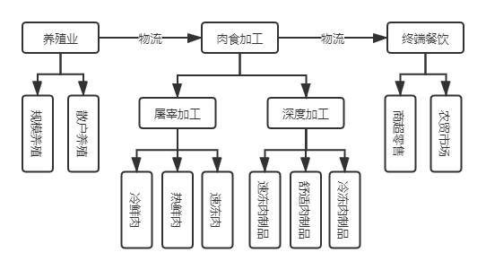 整个生猪产业链主要分为五个环节:生猪养殖、饲料生产、屠宰运输、肉制品生产和产品销售。其中尤以养殖、屠宰和肉制品生产最为核心,这三项是整个生猪产业链条中的核心所在。在这三项之中又以肉制品生产最为关键。