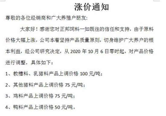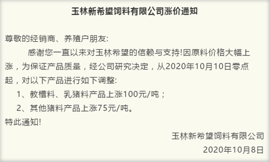 在原料涨价影响下,玉林正邦、玉林新希望分别宣布于10月6日和8日起涨价,其中猪料产品上涨75-100元/吨不等。在9月已有多家饲料企业涨价,大多位于云南、贵州等地区,此次广西两家饲企涨价或将带动新一轮上涨。