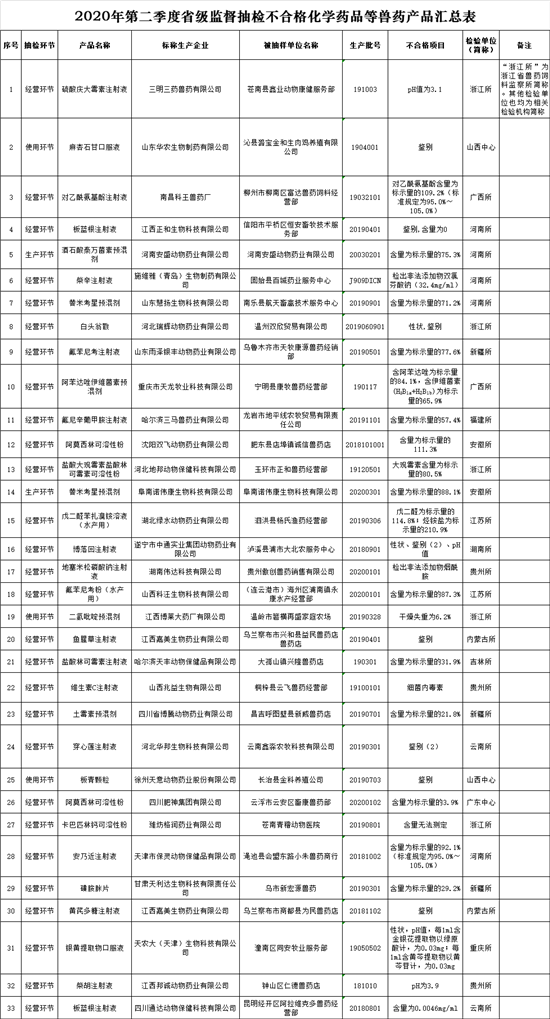 2020年第二季度完成化学药品等兽药产品省级监督抽检2381批,不合格37批。