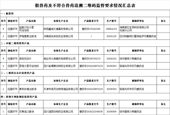2020年第二季度监督抽检中发现假兽药2批,不符合兽药追溯监管要求的兽药产品4批。