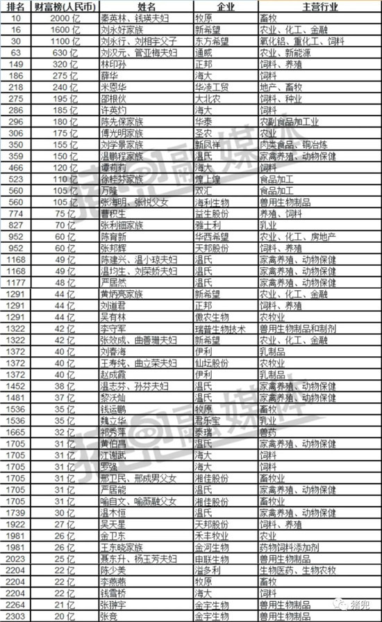 传统行业增长较快的为河南“养猪大王”牧原的秦英林钱瑛夫妇,财富增长1倍至2000亿,首次进入前十。猪兜融媒体统计:今年农牧行业上榜“胡润百富榜”的企业家共计53人,今年前三名和去年一样,仍然是牧原、新希望和东方希望,从上榜人数来看,温氏上榜人数最多有9人,海大6人,新希望、牧原均为3人,正邦、天邦、伊利、湘佳股份、金宇生物均为2人,溢多利、金河生物为2020年新上榜饲料企业,另外还有海利生物、瑞普生物、申联生物、金宇生物等兽用生物制品企业上榜。