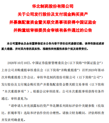 10月12日,华北制药发布公告称,此次资产收购重组预案获得中国证监会并购重组审核委员会审核有条件通过。