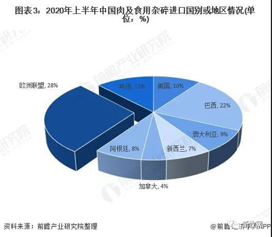 就肉类及食用杂碎进口国别或地区来看,我国猪肉供应国主要以欧盟、巴西、美国等地区为主。2020年上半年中国向欧盟、巴西、美国等地区进口占比分别为28%、22%、10%等。