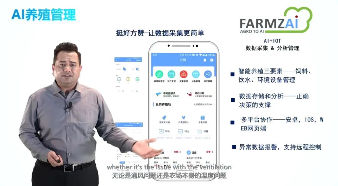 无论是在动物疾病管理、饲养饲喂、环境控制等方面,我们都可以通过智能化的手段,通过图像识别、语音识别、物联网传感器设备、以及数据分析等非常精准的智能化解决方案应用到我们的养殖场,来提升我们的养殖效率很产业效益。