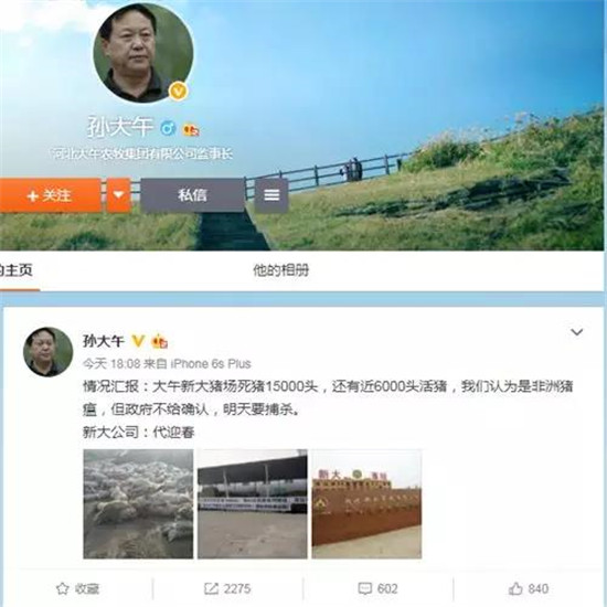 2019年2月22日晚间,孙大午在其认证新浪微博公开爆料称:大午新大猪场死猪15000头,还有近6000头活猪,我们认为是非洲猪瘟,但政府不给确认,明天要捕杀。而在他披露之前,河北尚未报告有非洲猪瘟疫情。