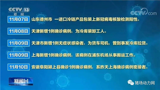11月7日,天津市滨海新区接到山东省德州市通报,经天津从境外进口的冷冻食品外包装标本新冠病毒核酸检测呈阳性。随后,天津报告1名装卸工确诊感染新冠病毒。11月9日,天津市新增1名无症状患者,为货车司机,曾到该确诊病例所工作的冷库拉货。目前,山东德州、山西太原、河北保定等涉疫情货物流入地正在加紧排查。今年6月以来,已有至少10余省份在冷链冻品中检出新冠病毒阳性。