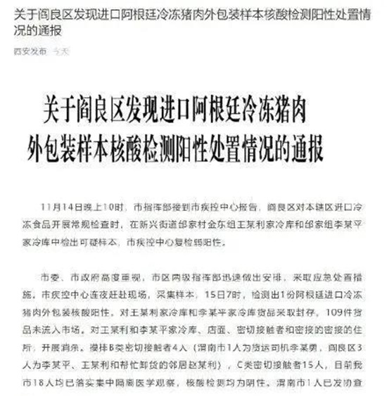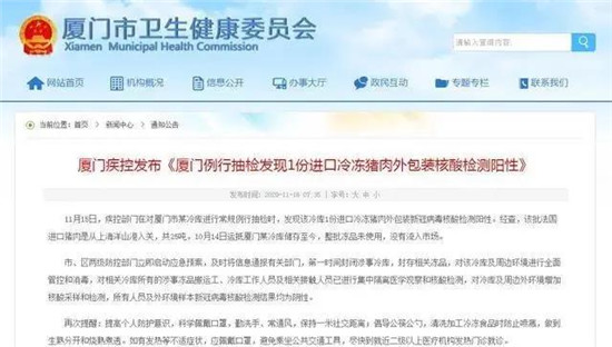 据厦门网报道 11月15日,疾控部门在对厦门市某冷库进行常规例行抽检时,发现该冷库1份进口冷冻猪肉外包装新冠病毒核酸检测阳性。