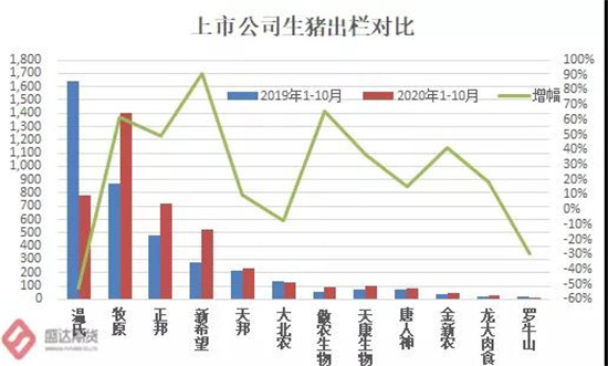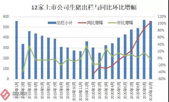 牧原、正邦、新希望、温氏(2020年10月生猪出栏数量前4名)等12家上市企业,他们月度生猪销售简报显示:2020年10月生猪出栏小计559.66万头,同比增幅103.79%,环比降幅1.81%。