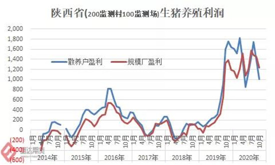 据陕西省监测:2020年10月,散养户平均每出栏100公斤生猪盈利1011.58元,规模场平均每出栏100公斤生猪盈利1235.23元。