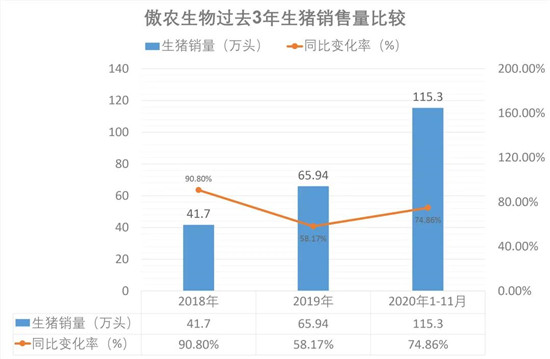 2018年、2019年、2020年前11月傲农生物年生猪销量分别为41.7万头、65.94万头、115.3万头,其中2020年前11个月就已基本实现2019年全年生猪销售量的2倍。此前,傲农生物在股权激励计划中提出2020年、2021年、2022年三年会计年度,生猪销量分别不低于150万头、300万头、600万头。而时至11月末,傲农生物2020年共销售生猪115.3万头,距离150万头的目标还有34.7万头。如要要完成目标,12月份生猪销售量环比增长率应为74.2%。全年来看,环比大于增长大于70%的只有2月份,但1月份因非洲猪瘟跟新冠肺炎疫情的多重影响处于2020年的最低位。元旦前的猪肉消费狂热或许会带动猪肉销量的增长,但是整体看12月份完成34.7万头的销售业绩有一定难度。