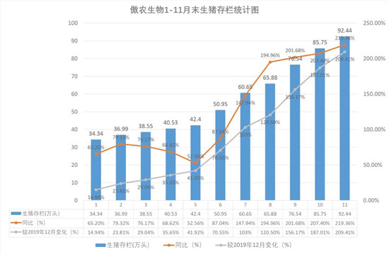 12月2日,福建傲农生物科技集团股份有限公司(下称,傲农生物)发布11月养殖业务主要经营数据公告。公告显示,傲农生物11月销售生猪19.92万头,销售量环比增长27.39%,同比增长486.52%。11月末,生猪存栏92.44万头,环比增长7.8%,同比增长219.36%,较2019年12月末也增长209.41%。