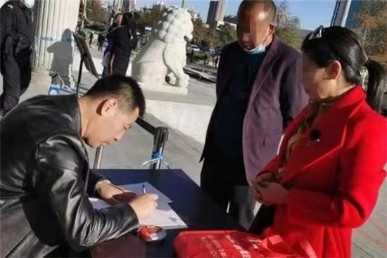 11月24日,在农安县人民法院执行指挥中心,长春众品企业代表陈经理和农安县84户养殖户代表马先生一同将上书“为企业保驾护航正气浩然、给百姓排忧解难克己奉公”的锦旗送到农安县法院法官手中,表达着自己的谢意。