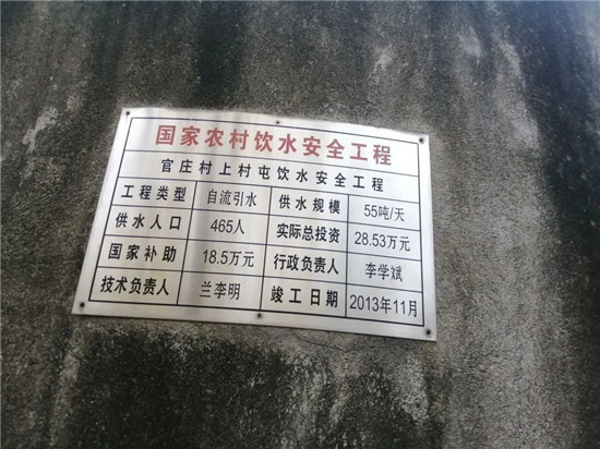旁边一块牌匾介绍,上村屯这套自来水设施建于2013年,是“国家农村饮水安全工程”,总投资28.53万元,其中国家补助18.5万元,供水规模55吨/天。