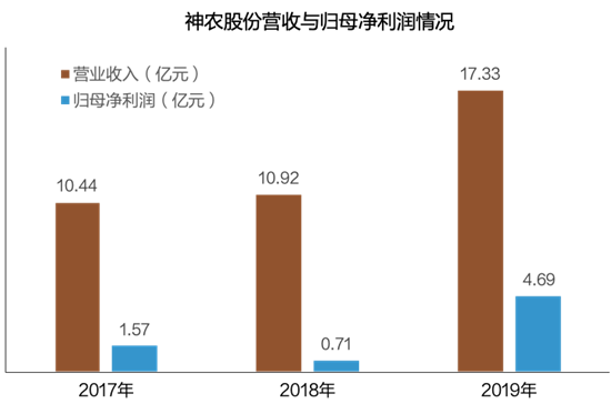 报告期内,神农股份实现营业收入10.44亿元、10.92亿元和17.33亿元,年复合增长率28.87%;实现归属于母公司所有者的净利润1.57亿元、0.71亿元和4.69亿元,年复合增长率达72.66%。