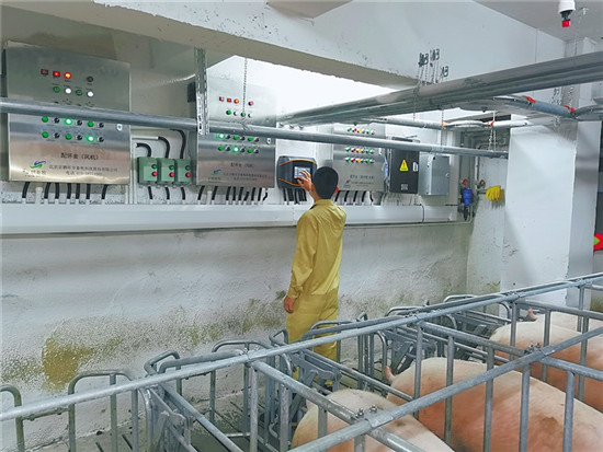 罗牛山股份有限公司儋州乐满20万头生猪产业项目采用楼房养殖等新模式、新技术。图为工人在查看设备仪表。(特约记者李珂供图)