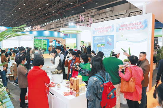 以儋州猪肉为原料的农副产品深受市场欢迎。图为在今年冬交会上,观展宾客在品尝以儋州猪肉为原料制作的儋州粽子、腊肠等。通讯员黎有科摄