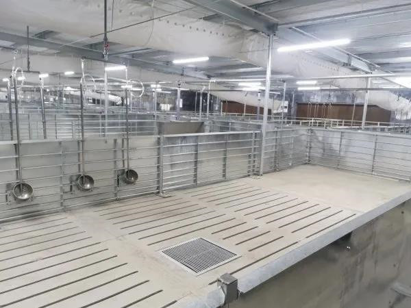 在参观时,记者发现每个猪圈的地面都被分成两个区域,一侧地面平整,另一侧是漏缝地面。
