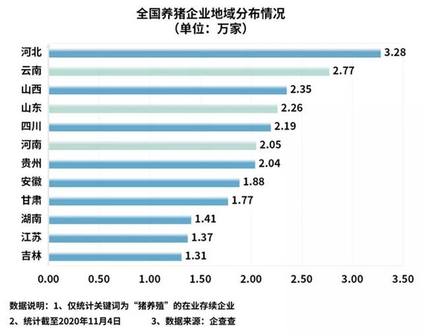 2020年,随着全国规模猪场的复养扩群,新增产能陆续释放。据农业农村部监测数据显示,11月末全国能繁母猪存栏超过4100万头、生猪存栏超过4亿头,生猪产能已恢复到2017年底的90%以上。数据显示,目前我国共有35.5万家生猪养殖相关企业(如图2,图3),河北以3.28万家企业排名第一,云南、山西分列二三名,分别为2.77万家、2.35万家。山东、四川、河南分列第四、五、六位,其中四川和河南分别为2.19万家、2.05万家。其中2020年前三季度新增生猪养殖企业6.2万家,同比增长127.3%,其中三季度新注册2.3万家。