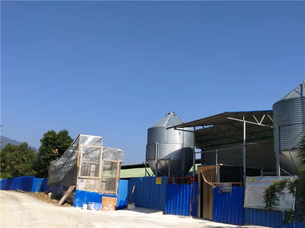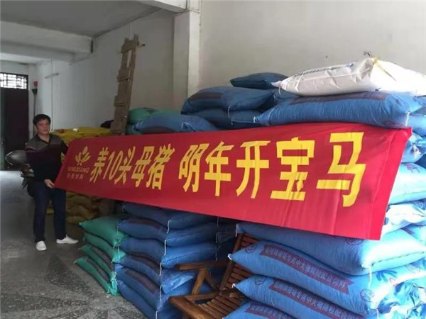 (陆老板在垒高的饲料包上挂起横幅)