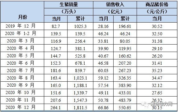 1月3日,牧原公布2020年12月份生猪销售简报,显示公司12月份销售生猪264.1万头,销售收入66.86亿元。其中向全资子公司牧原肉食品有限公司销售生猪13.7万头。商品猪销售均价30.15元/公斤,比2020年11月份上涨14.55%。
