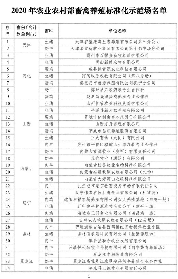 农业农村部公布2020年180家畜禽养殖标准化示范场名单: