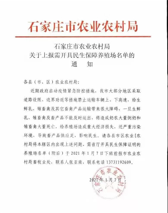 1月7日,石家庄市农业农村局印发《关于上报需开具民生保障养殖场名单的通知》,指出近期政府启动疫情紧急防控措施,石家庄市大部分地区采取道路设限、边界劝返等措施禁止运输车辆上、下高速,给生鲜乳、雏畜禽及其他畜禽产品运输带来很大障碍,一旦生鲜乳、雏畜禽及畜产品不能及时运出,将造成奶农大量倒奶和雏畜禽大量死亡,给养殖场造成重大经济损失,还严重污染环境,影响民生。请各县市区将本辖区内出现上述问题、需省厅开具民生保障证明的养殖场名单报送市农业农村局。