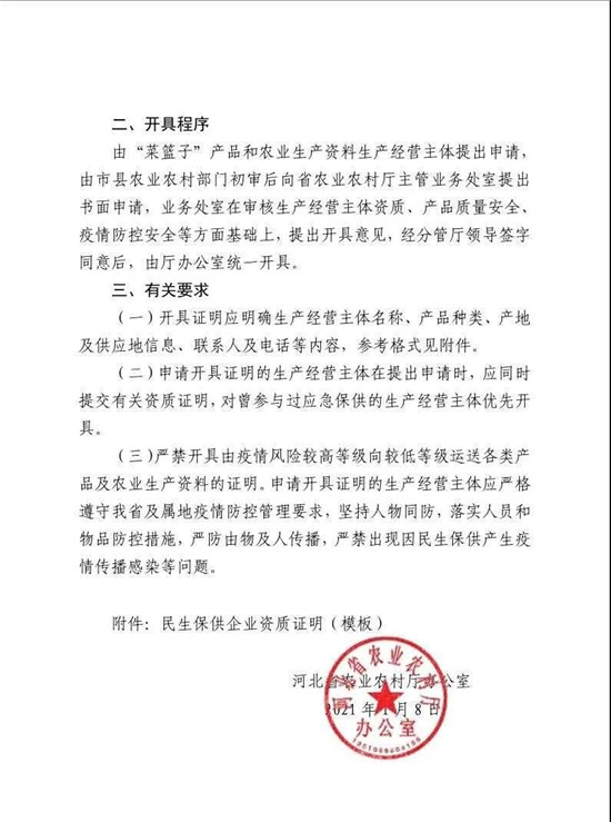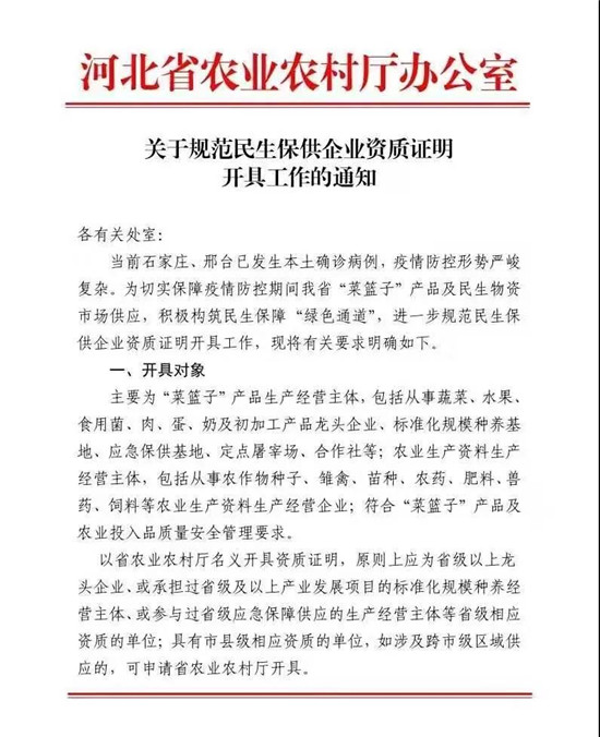 1月8日,河北省农业农村厅发布《关于规范民生保供企业资质证明开具工作的通知》,指出当前石家庄、邢台疫情防控形势严峻复杂,为切实保障疫情防控期间河北省“菜篮子”产品及民生物资市场供应,积极构筑民生保障“绿色通道”,“菜篮子”产品生产经营主体可向省农业农村厅申请开具民生保供企业资质证明。
