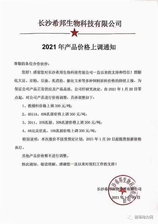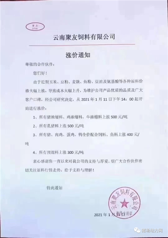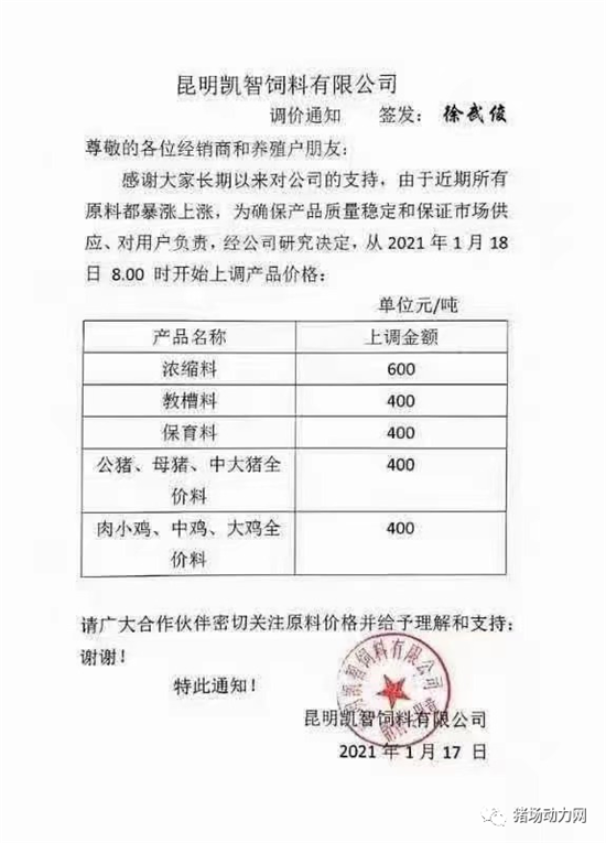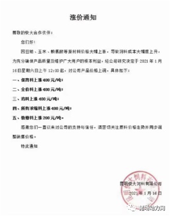 过去一年,饲料价格经历了多次涨价潮,一度刷新历史价格。进入新的一年,玉米、豆粕的价格依旧没有停下上涨的脚步,甚至一些地区玉米价格已经突破3000元/吨、豆粕出厂价格已达到4150元/吨,在原料上涨行情的带动下,近日多个企业又掀起了新的一轮涨价潮,有企业甚至一次涨价幅度达到600元/吨。