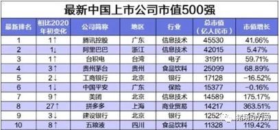近日,21数据新闻实验室日前发布中国上市公司市值500强榜单。数据显示,2020年末,500强企业总市值约86.0万亿元,较2019年的63.7万亿元上涨了35%,榜单排名前三分别为腾讯、阿里和台积电,市值都超过3万亿。