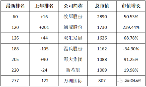 此外,以饲料业为主营业务的海大同样表现不俗,以1009亿的市值排名第205位,上涨90位。