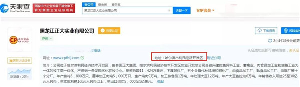 通过天眼查资料显示,黑龙江正大位于哈尔滨市利民经济开发区,是由泰国正大集团、哈尔滨利民经济技术开发区实业开发总公司合资兴建的现代化农牧企业。(也就是说,该公司并无进口肉类相关业务。)
