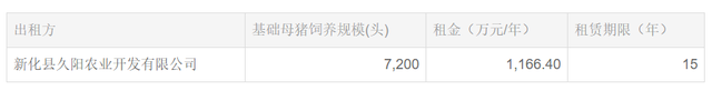 公告显示,新五丰从新化久阳租赁猪场的租金合计1166.40万元/年,租赁15年的总金额合计1.7496亿元。