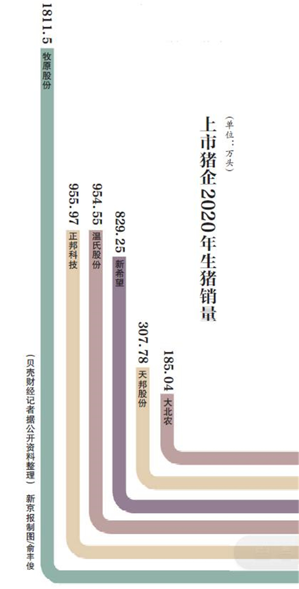 根据上市公司公开披露数据,2021年,牧原股份目标出栏量5000万头,新希望、正邦科技目标出栏量均为2500万头。温氏股份2年前曾定下3000万头的销售目标,但据温氏股份证券部人士告诉记者,这是之前规划的目标,“现在情况发生变化,年内预计很难完成目标。可以预见,猪企间的“二哥争夺战”在2021年仍将继续下去。