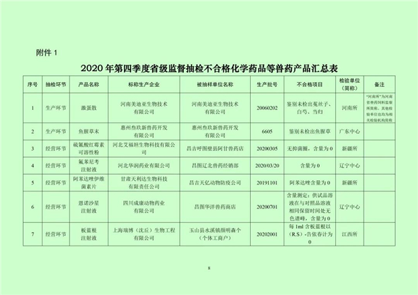 附件:1. 2020年第四季度省级监督抽检不合格化学药品等兽药产品汇总表