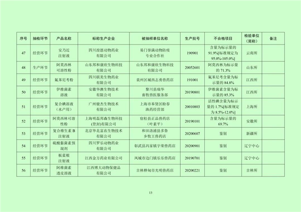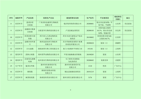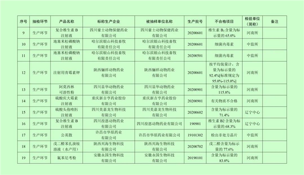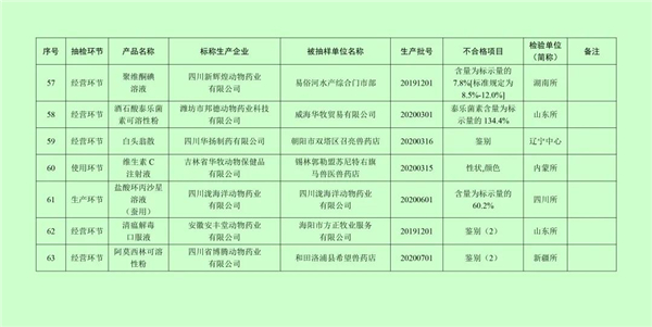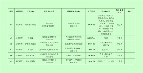(一)惠州叁玖新兽药开发有限公司(当期兽药质量通报的中药产品鉴别中有一种或一种以上的成分未检出)。
