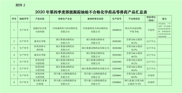 2. 2020年第四季度部级跟踪抽检不合格化学药品等兽药产品汇总表
