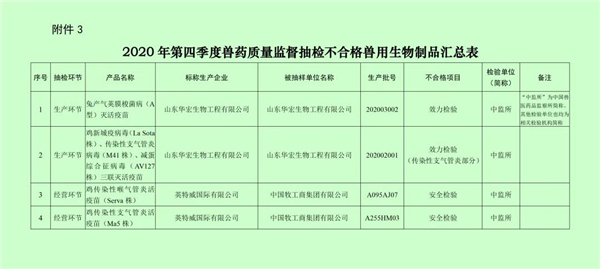 3. 2020年第四季度兽药质量监督抽检不合格兽用生物制品汇总表