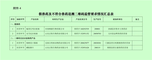 4批不符合兽药追溯监管要求的兽药产品中,有2批兽药产品为假兽药,有2批兽药产品二维码无法识读。