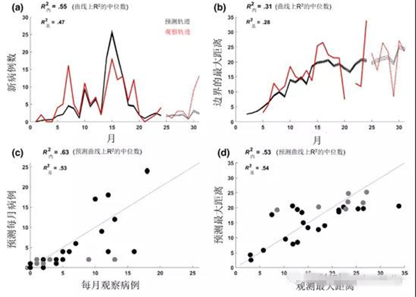 新病例的轨迹(a)和观察(红色)和预测(黑色)到边界的最大距离(b)。阴影区域表示根据参数的后验分布从1,000次模拟中得出的95%可信区间。实线表示用于参数估计的数据,而虚线表示样本外的预测。c和d显示了每月情况(c)和距边界的最大距离(d)的观察点与预测点(其中每个点是每个时间所有模拟的中位数)。样本内预测点(2014–2015)为黑色,样本外预测点(2016)为灰色。灰色虚线表示点的预期拟合度(观察点和预测点的比例为1:1)