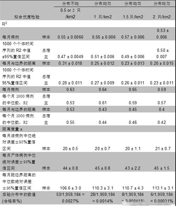 近似贝叶斯法计算使用距离度量(模型预测和观测数据之间的差异)为后验分布选择参数集,这是一种衡量模型参数集与观测数据中目标模式的近似程度的方法。我们同时使用三个距离度量;分别为:(a)来自尸体的每月病例数,(b)来自猎人采集样本的每月病例数,以及(c)每月距边境的最大距离的总和。距离度量公差值为:尸体的每月病例数为48,猎人采集样本的每月病例数为24,每月距边境的最大距离的为120。所有3个指标的结果低于这些值的参数集,构成后验分布。这使得平均错误率为2例(尸体)和1例(猎人狩猎),平均每月离边界5公里。根据我们认为可接受的误差水平来选择公差值,用于规划控制策略和风险评估。此外,更严格的错误率将需要大量的计算资源,除非先验分布得到更多的信息。