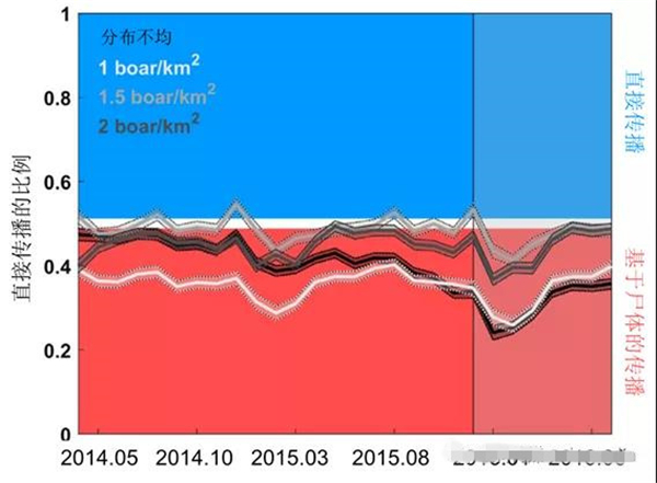 我们假设非洲猪瘟在野猪中具有100%的致死性。事实上,该地区的监测数据表明,在暴发地区,有低于1%的幸存者检测出抗非洲猪瘟病毒抗体阳性(国家兽医研究所未公布的数据)。因为我们假设了绝对致死率,所以我们的模型预测,随着时间的推移,持续传播的非洲猪瘟病毒会导致宿主密度降低和基于尸体的传播水平升高。但是,如果该地区出现了致死性降低的非洲猪瘟病毒毒株,那么可能会出现不同的流行病学动态。具体来说,如果有更多的宿主存活,它们将可以繁殖,保持较高的宿主密度,仅通过直接传播就可能导致持久性或复发性流行。因此,对致死率变化的监视对于随时间推移,优化局部区域的控制策略很重要。