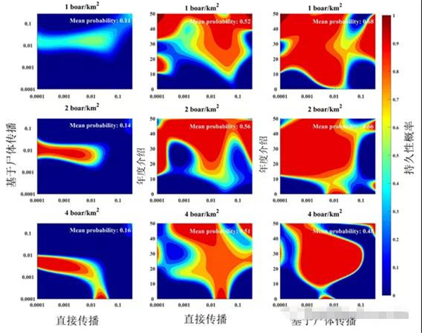 颜色显示ASFV持续存在的概率,深红色代表高概率,黄色代表中度高概率,浅蓝色代表中度概率,深蓝色代表低概率。