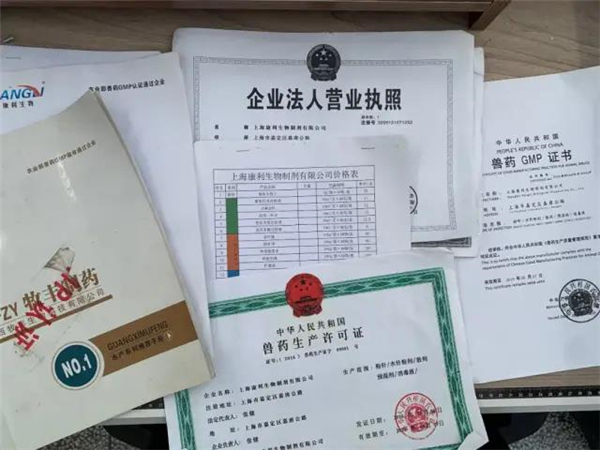 产品报价单、说明书、GMP认证、生产许可证……看似“正规”的手续一应俱全。执法人员初步判断,这是一个有组织、有计划,销售假兽药的作案团伙。通过几个月的连续循线追踪、深入摸排,专案组在河南省郑州市、驻马店市抓获杨某的上线庄某、张某等4人。