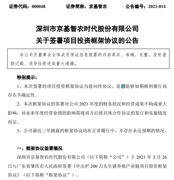 京基智农表示,本次与肇庆市人民政府签署框架协议,一方面是为了推进生猪生产规模化、标准化,发展现代养殖业,助力产业发展,另一方面则是为了响应国家全面推进乡村人才振兴的政策号召,配合肇庆市人民政府做好引导城市人才下乡工作。公司在当地政府及相关部门的支持下建设生猪养殖产业链项目,可加速构建农业全产业链,符合公司的长期战略规划。